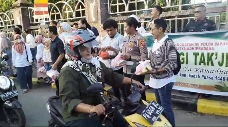 Puluhan paket takjil dibagikan kepada pengendara roda dua dan empat, serta pejalan kaki. Kegiatan ini merupakan wujud kepedulian personel kepolisian khususnya Alumni SIP Angkatan 50 Polda Papua terhadap masyarakat yang sedang dalam perjalanan menjelang waktu berbuka puasa.