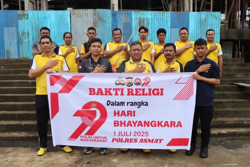 Papua – Dalam rangka menyambut Hari Bhayangkara ke-79 yang jatuh pada tanggal 1 Juli 2025, Polres Asmat melaksanakan kegiatan Bakti Religi di enam rumah ibadah yang tersebar di Kota Agats. Kegiatan ini dipimpin langsung oleh Kapolres Asmat, AKBP Wahyu Basuki, S.I.K., bersama para Pejabat Utama (PJU) dan personel Bintara Polres Asmat.