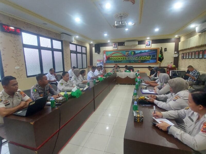 Kegiatan pemeriksaan berlangsung di Aula Biddokkes Polda Papua dan dihadiri oleh Kabiddokkes Polda Papua Kombes Pol dr. Bambang Pitoyo Nugroho, KA Rumkit Polda Papua Dr. Rommy Sebastian, dr., M.Kes., M.H., CPM., QHIA, serta para pejabat dan staf Biddokkes dan Rumkit Polda Papua.