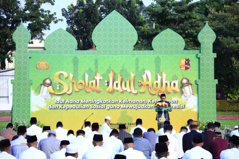 Jakarta – Mabes Polri menggelar salat Idul Adha 1446 Hijriah di Lapangan Bhayangkara, Jakarta Selatan. Salat dipimpin oleh Ust. Muammar Samsudin yang merupakan Imam Masjid Baitul Hikmah Syurthah Mabes Polri dan Khatib Prof. Dr. Made Saihu M. Pd.