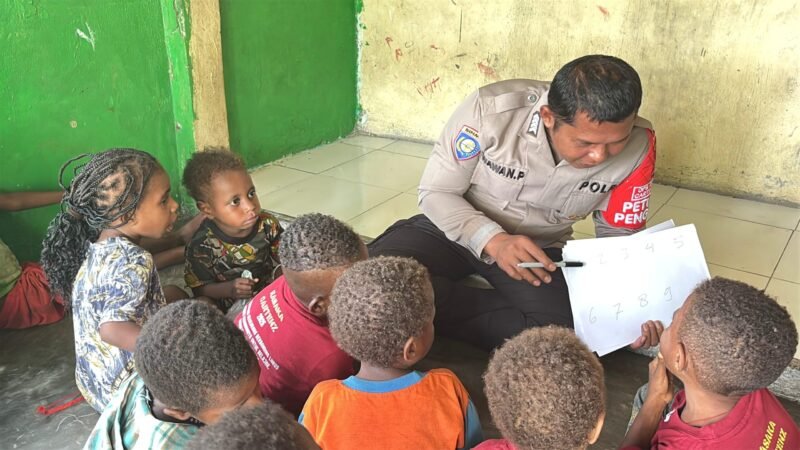 Papua – Polri terus berkomitmen meningkatkan kualitas pendidikan yang rutin dilaksanakan melalui Program Polisi Pi Ajar. Hal inilah yang dilakukan jajaran anggota Polisi di Kabupaten Yahukimo, Papua Pegunungan dengan mengajarkan anak-anak binaannya di jalan Sosial Distrik Dekai Kabupaten Yahukimo, Rabu (11/6/25).