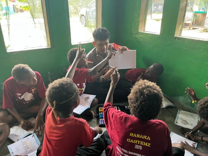 Papua – Polri terus berkomitmen meningkatkan kualitas pendidikan yang rutin dilaksanakan melalui Program Polisi Pi Ajar. Hal inilah yang dilakukan jajaran anggota Polisi di Kabupaten Yahukimo, Papua Pegunungan dengan mengajarkan anak-anak binaannya di jalan Sosial Distrik Dekai Kabupaten Yahukimo, Selasa (24/6/25).