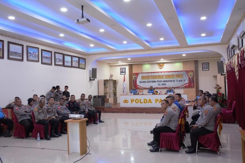 Papua – Irwasda Polda Papua, Kombes Pol. Jermias Rontini, S.I.K., M.Si memimpin Sidang Pemanggilan Tes Akhir Seleksi Sekolah Staf dan Pimpinan Pertama (Sespimma) Polri Angkatan Ke-73 dan 74 T.A. 2025 secara virtual. Kegiatan ini berlangsung di Aula Rastra Samara Polda Papua pada Selasa (11/02/2025).