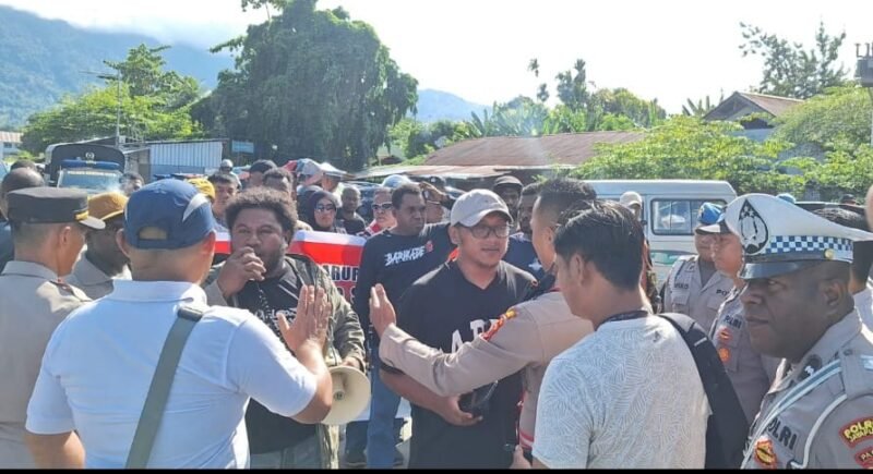 Papua – Aparat Kepolisian Sektor Kawasan Bandara Sentani membubarkan aksi demonstrasi tanpa izin yang digelar di pintu masuk Bandara Sentani, Jayapura. Aksi yang dipimpin oleh aktivis Papua, Panji Mangkunegoro, dinilai mengganggu aktivitas bandara dan melanggar aturan ketertiban umum, Selasa (12/08).