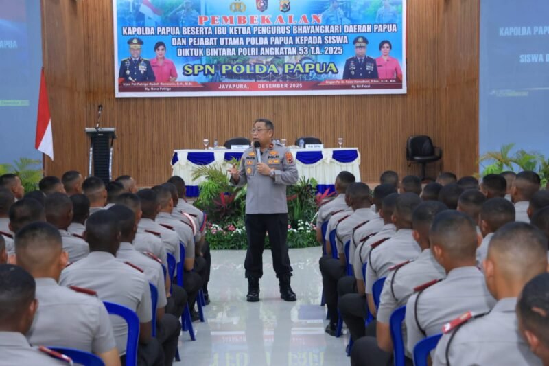 Papua – Wakapolda Papua Brigjen Pol. Dr. Faizal Ramdhani, S.Sos., S.I.K., M.H., dan Irwasda Polda Papua Kombes Pol. Jeremias Ronitini, S.I.K., M.Si., memberikan pembekalan kepada Siswa Pendidikan Pembentukan (Diktuk) Bintara Polri Angkatan 53 Tahun Anggaran 2025 di Aula Elsama Numberi, SPN Polda Papua, Selasa (16/12/2025).