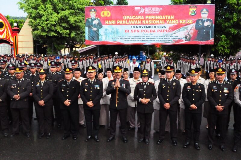 Papua – Dalam rangka memperingati Hari Pahlawan Nasional ke-80 Tahun 2025, Sekolah Polisi Negara (SPN) Polda Papua melaksanakan Upacara Bendera yang berlangsung khidmat di Lapangan Upacara SPN Polda Papua, Senin (10/11/2025). Upacara dipimpin langsung oleh Ka SPN Polda Papua, Kombes Pol. Andreas Tampubolon, S.I.K., M.K.P., serta diikuti oleh seluruh staf personel SPN dan resimen siswa “Parahita Raksaka”.