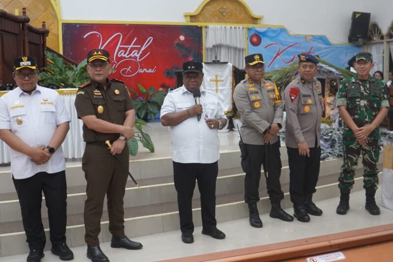 Manokwari – Dalam rangka memastikan kesiapan pengamanan dan kelancaran pelaksanaan ibadah malam Natal, Forkopimda Provinsi Papua Barat bersama Kapolda Papua Barat serta Tim Asistensi Mabes Polri melaksanakan kunjungan dan pengecekan di sejumlah gereja di Kabupaten Manokwari, Rabu (24/12).