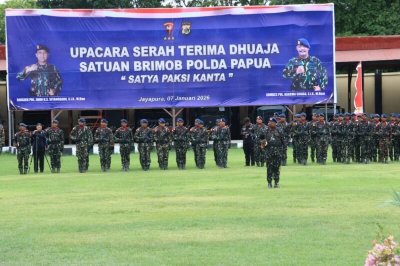 Papua – Kepala Kepolisian Daerah Papua Irjen Pol. Patrige R. Renwarin, S.H., M.Si., memimpin langsung upacara serah terima Dhuaja Satuan Brimob Polda Papua “Satya Paksi Kanta” yang dilaksanakan di Lapangan Hijau Mako Brimob Kotaraja, Kota Jayapura, Rabu (7/1/2026).