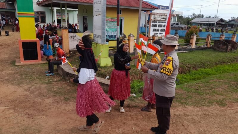 Papua – Polres Merauke melalui Polsek Jagebob mengamankan jalannya karnaval tingkat PAUD dan TK serta membagikan Bendera Merah Putih kepada para peserta di Kampung Kartini, Distrik Jagebob, Kabupaten Merauke, Rabu (13/8/2025),
