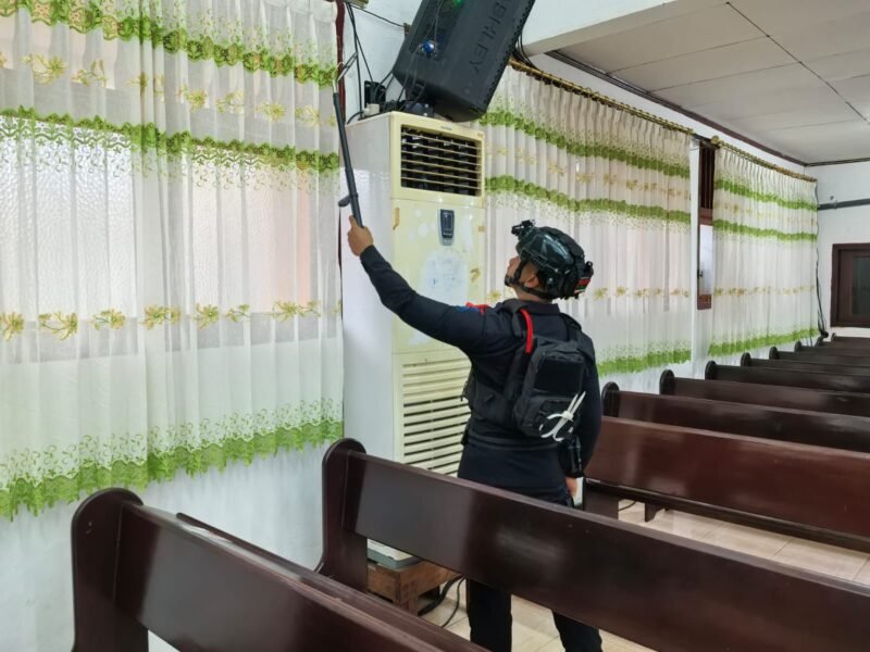 Manokwari – Menjelang pelaksanaan ibadah Natal, personel Satuan Brimob Polda Papua Barat yang tergabung dalam Operasi Lilin Mansinam 2025 melaksanakan kegiatan sterilisasi di sejumlah gereja prioritas guna memastikan situasi aman dan kondusif Rabu(24/12/25).
