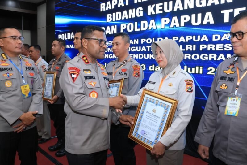 Papua – Kepala Kepolisian Daerah (Kapolda) Papua, Irjen Pol. Patrige R. Renwarin, S.H., M.Si., memberikan piagam penghargaan kepada sejumlah Satuan Kerja (Satker) dan personel berprestasi di bidang administrasi keuangan Polri, Kamis (03/07/2025).