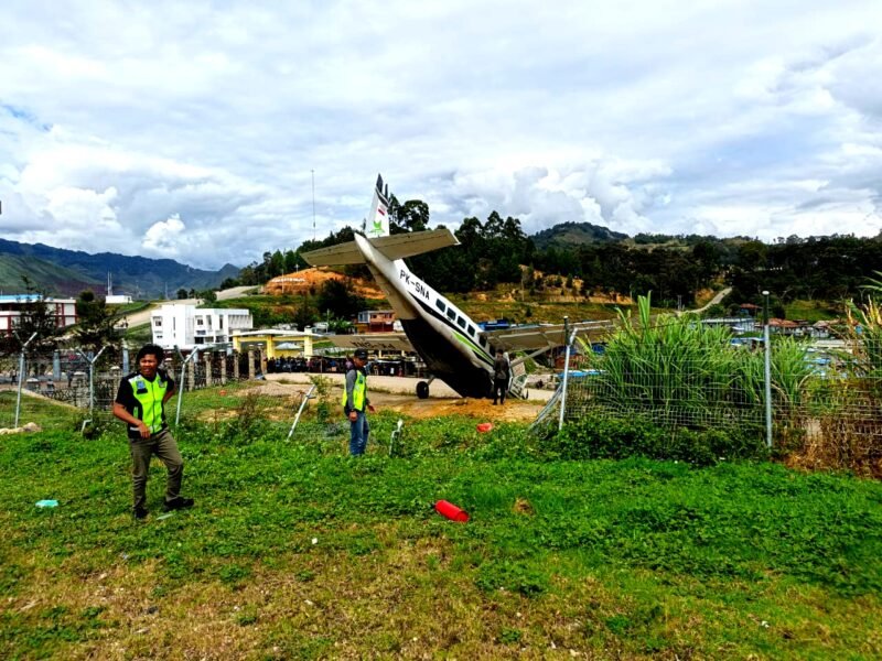 Papua – Sebuah pesawat Smart Air Jenis Caravan C208 dengan nomor registrasi PK-SNA tergelincir di Lapangan Terbang Tiom, Kabupaten Lanny Jaya, pada Sabtu (11/10). Pesawat tersebut diketahui sedang mengangkut bahan makanan dan cargo dari Kabupaten Mimika menuju Kabupaten Lanny Jaya.