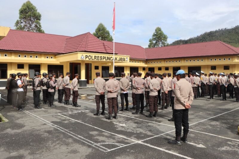 Papua – Bertempat di Lapangan Apel Mako Polres Puncak Jaya, Kepala Kepolisian Resor Puncak Jaya AKBP Kuswara, S.H., S.I.K., M.H memimpin langsung pelaksanaan apel pagi jam pimpinan yang diikuti oleh seluruh PJU dan Personel Polres Puncak Jaya, Senin (16/12/2024).