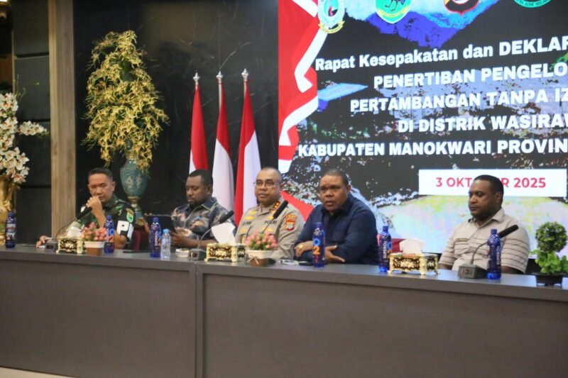 Papua Barat – Kepolisian Daerah Papua Barat menunjukkan keseriusan dalam menangani aktivitas Pertambangan Tanpa Izin (PETI) yang marak terjadi di Distrik Wasirawi, Kabupaten Manokwari. Langkah konkret itu diwujudkan melalui kehadiran Kapolda Papua Barat Irjen Pol Johnny Eddizon Isir, S.I.K., M.T.C.P., pada Rapat Kesepakatan dan Deklarasi Bersama Penertiban Pengelolaan Pertambangan Tanpa Izin (PETI) yang berlangsung di Aula Sasana Karya, Kantor Bupati Manokwari, Jumat (3/10/2025).