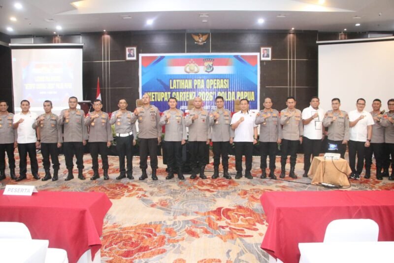 Papua – Kepolisian Daerah Papua melaksanakan kegiatan Latihan Pra Operasi (Latpraops) Ketupat Cartenz 2026 sebagai bentuk kesiapan personel dalam memberikan pelayanan dan pengamanan kepada masyarakat pada perayaan Idul Fitri 1447 Hijriah tahun 2026. Kegiatan tersebut berlangsung di Grand Ballroom Ultima Hotel Horison Ultima, Jayapura, Rabu (11/3/2026).