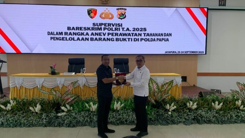 Papua – Kepolisian Daerah Papua menerima supervisi dari Tim Bareskrim Polri Tahun Anggaran 2025 dalam rangka Analisa dan Evaluasi (Anev) Perawatan Tahanan dan Pengelolaan Barang Bukti. Kegiatan tersebut berlangsung di Aula Rastra Samara Mapolda Papua, Rabu (24/09).