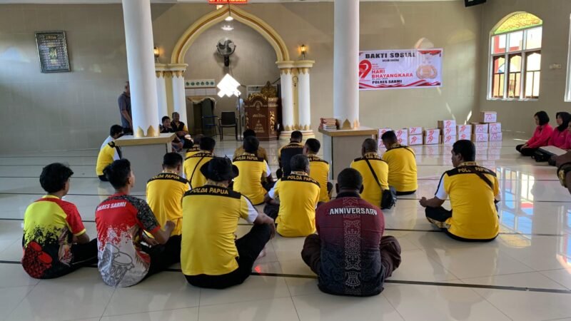 Papua – Dalam rangka menyambut Hari Bhayangkara ke-79, Polres Sarmi Polda Papua menggelar kegiatan Bakti Sosial dengan membagikan paket sembako kepada pengurus Masjid Ar-Rahman Kuma, yang terletak di Kelurahan Mararena, Kabupaten Sarmi, pada Selasa (24/6/2025).