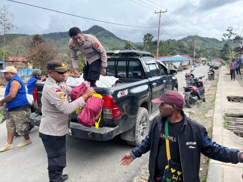 Papua – Polres Tolikara bersama Dinas Sosial Kabupaten Tolikara menyalurkan bantuan sosial berupa paket sembako kepada warga yang terdampak kebakaran di Karubaga, Sabtu (14/02/2026).