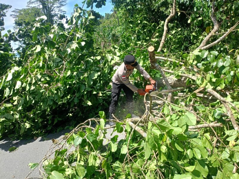 Papua – Personel Polsek Muara Tami bergerak cepat menindaklanjuti laporan masyarakat terkait pohon tumbang yang menghalangi akses lalu lintas di Jalan Poros Koya Tengah, Distrik Muara Tami, Kota Jayapura, Rabu (21/1/2026).