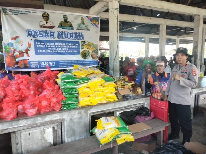 Papua – Menjelang perayaan Natal dan Tahun Baru 2024, Polsek Pantai Timur (Polda Papua) turut mengawal pelaksanaan Pasar Murah yang digelar oleh Tim Perindagkop Kabupaten Sarmi Provinsi Papua di Pasar Kampung Takar I Distrik Pantai Timur Bagian Barat, Jumat (20/12/2024