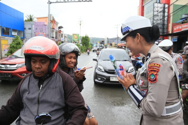 Polwan Cantik Ditlantas Polda Papua Barat Bagikan Coklat dan Bunga kepada Pengendara Tertib dalam Operasi Zebra Mansinam 2025