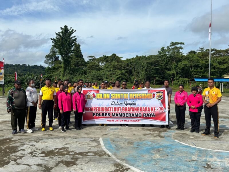 Papua – Dalam rangka memperingati Hari Ulang Tahun (HUT) Bhayangkara ke-79 yang jatuh pada 1 Juli 2025, Polres Mamberamo Raya menggelar kegiatan jalan santai bersama yang berlangsung pada Sabtu pagi (28/06/2025) di halaman Mapolres Mamberamo Raya. Kegiatan ini dipimpin langsung oleh Kapolres Mamberamo Raya, AKBP Arifin, dan diikuti oleh jajaran anggota Polres, Bhayangkari, serta unsur TNI dan Brimob setempat.