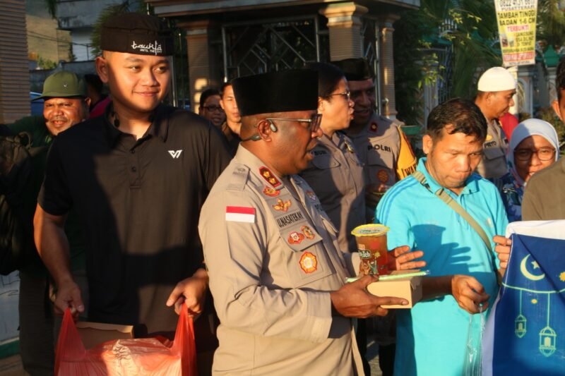 Papua – Kapolres Jayapura, AKBP Umar Nasatekay, S.I.K., bersama sejumlah jurnalis melaksanakan kegiatan sosial berupa pembagian takjil kepada masyarakat yang melintas di depan Masjid Al-Aqsha Sentani, Jumat (28/3).