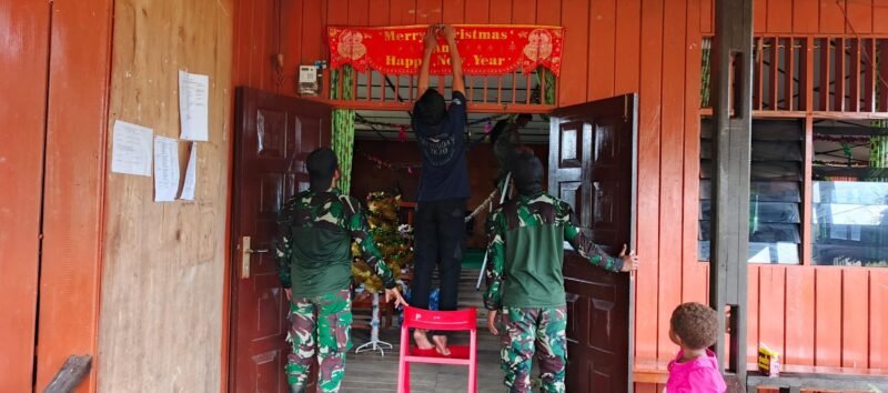 Papua – Dalam rangka menyambut perayaan Natal yang penuh sukacita, Pos Oksibil Satgas Yonif 512/QY bersama masyarakat setempat bergotong-royong mendekorasi Gereja Santo Yusuf di Oksibil. Selasa, (24/12/2024).