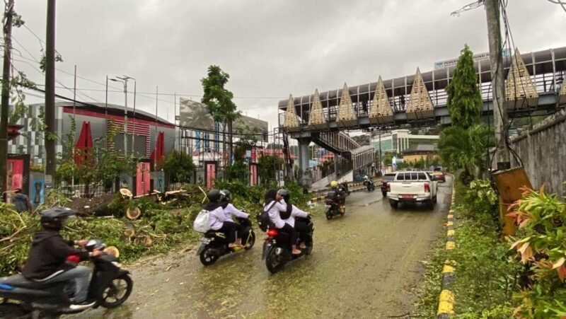 Papua – Tim SAR Direktorat Samapta Polda Papua melaksanakan aksi cepat tanggap dengan membersihkan pohon tumbang yang menghalangi jalan di depan Gedung Olahraga (GOR) Jayapura, usai hujan deras disertai angin kencang yang melanda wilayah tersebut, Selasa (28/10/2025).