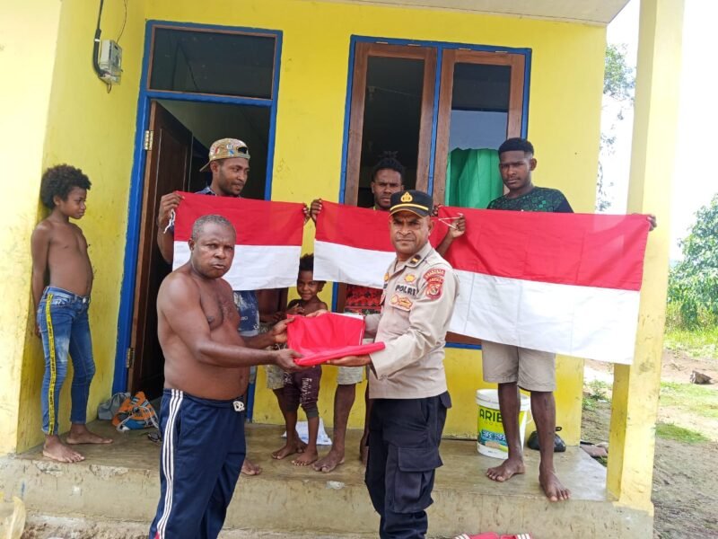 Papua – Dalam rangka menyambut Hari Ulang Tahun (HUT) Kemerdekaan Republik Indonesia ke-80, Kanit Binmas Polsek Muara Tami, IPDA Yanto Rumbruren, bersama jajaran melaksanakan kegiatan pembagian Bendera Merah Putih kepada warga masyarakat di Kampung Mosso, Distrik Muara Tami, Kota Jayapura, Selasa (12/08/2025) pagi.
