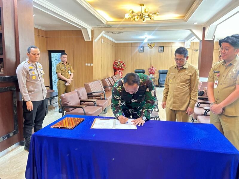 Bitung – Berlangsung di Ruang Merdeka Lounge Kantor Walikota Bitung, Kel. Bitung Barat Satu, Jl. Sam Ratulangi Kec. Maesa Kota Bitung, Acara penandatangan Karya Bakti dalam rangka revitalisasi Marshalling Area (MA) Yon TP 916 Makawidey, Selasa (24/02/2026).