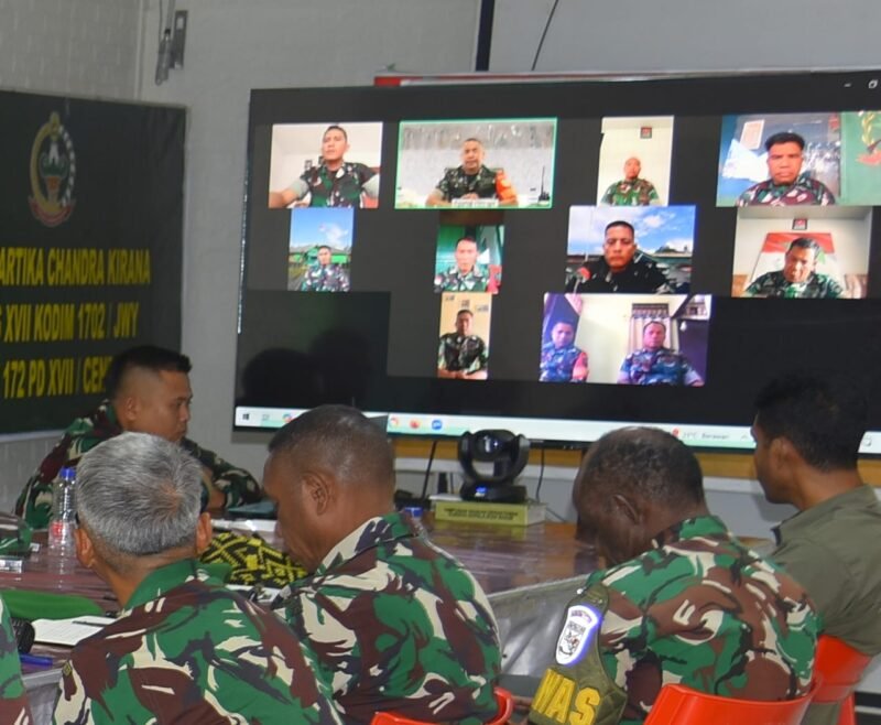 Wamena – Dandim 1702/Jayawijaya Letkol Arh Reza Ch. A. Mamoribo, S.E., M.Han., memimpin Video Conference (Vicon) dengan seluruh jajaran Koramil di wilayah Kodim 1702/Jayawijaya, dalam rangka evaluasi kegiatan yang telah dilaksanakan sepanjang tahun 2024, serta untuk memastikan kesiapan dalam menjaga keamanan menjelang perayaan Tahun Baru 2025, digelar bertempat di Ruang Data Makodim 1702/Jayawijaya, Jln.Yos Sudarso, Distrik Wamena, Kab. Jayawijaya, Prov. Papua Pegunungan, Senin (30/12/2024).